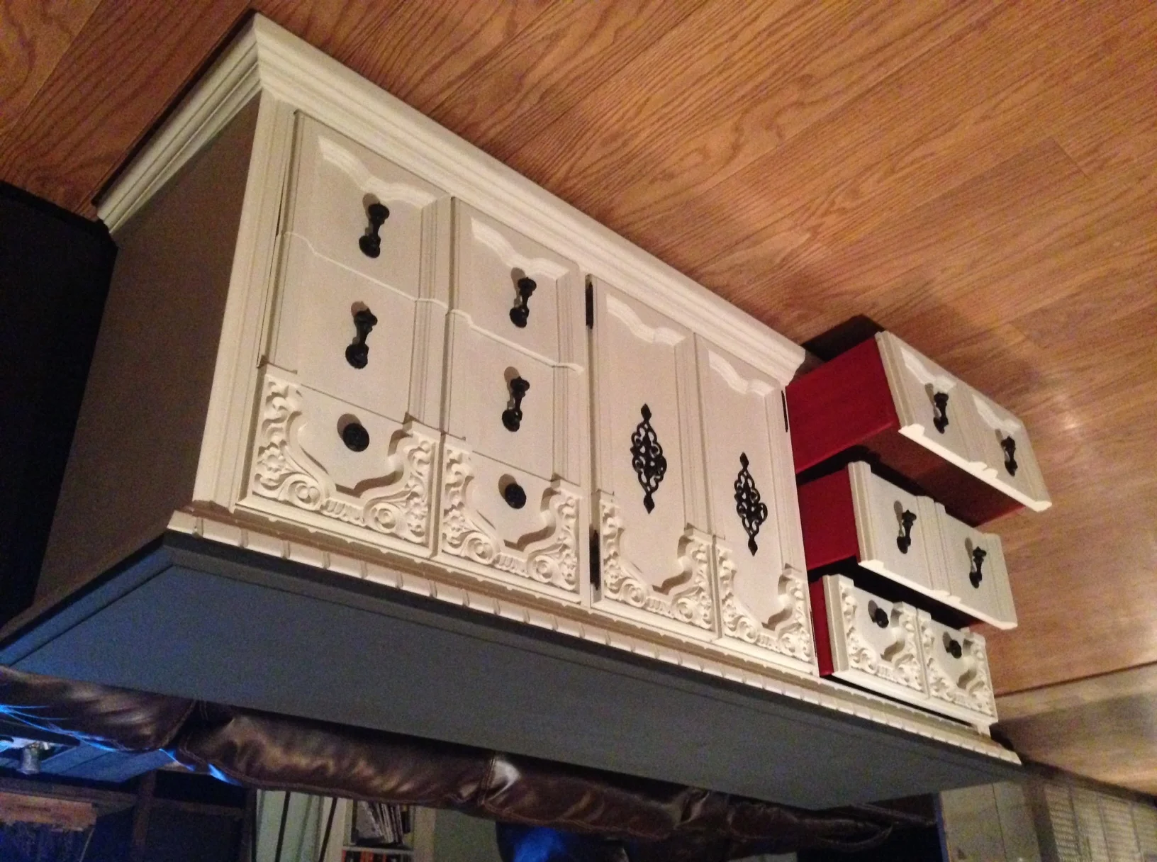 Just finished up this Broyhill console/dresser piece last night! The insides were done with Annie Sloan’s Emperor’s Silk, the body in Old White and the hardware & top in Graphite. When I found this at the ReStore, I was hoping I could salvage the top and re-stain, but it didn’t work out that way. I actually got the black and white idea from my Mom who did something very similar a few months ago. You know what they say about imitation! In her honor, I name this piece Bethy. Here’s B at the ReStore (I really need to remember to get better before pictures)